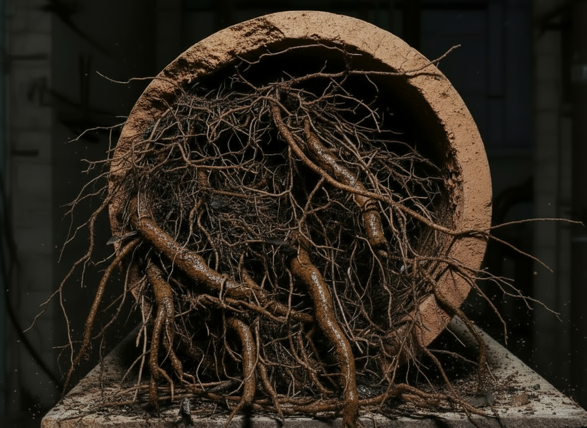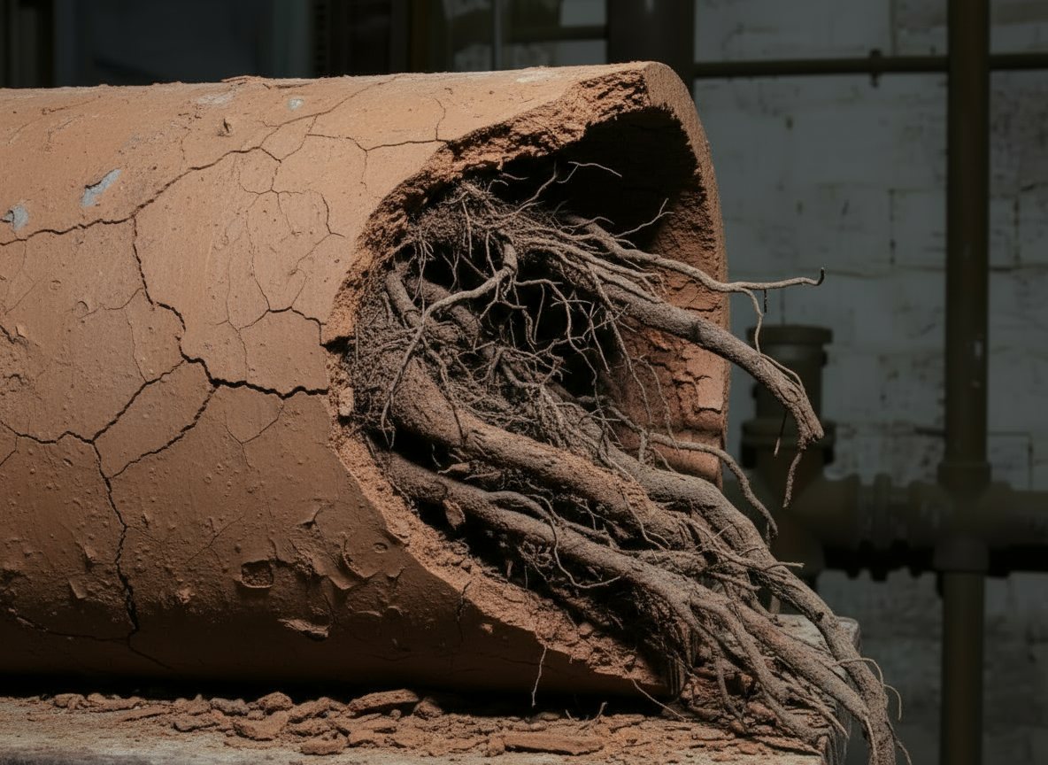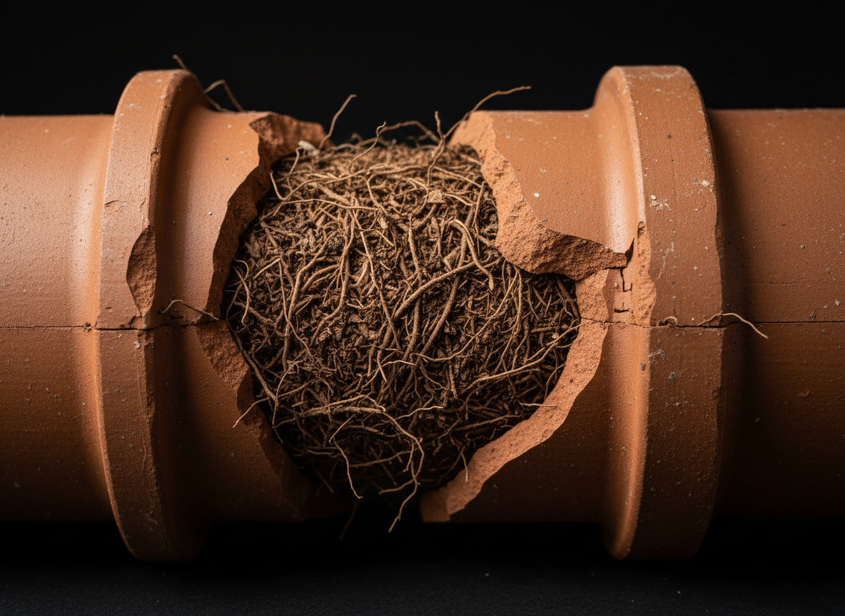 Tree roots penetrate through cracks and joints, causing severe blockages and structural damage to deteriorating clay pipes.